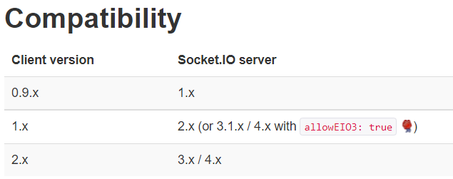 가보면 이렇게 호환성 얘기를 써놨음 만약에 socket.io연결이 안된다 그러면 hoxy? 버전이 차이나서 안되나 이런걸 확인해보자!