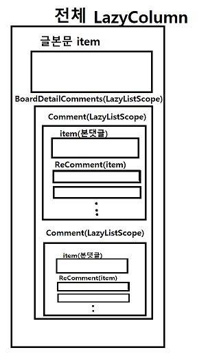 LazyColumn안에 item을 여러개 넣을 수 있는 LazyListScope안에 또다시 LazyListScope를 넣는것임 그리고 그 LazyListScope에 댓글 대댓글을 item으로 넣는것