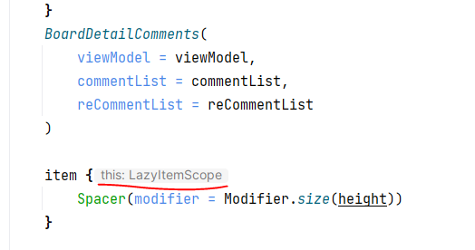 보면 item은 LazyItemScope이다 그러면 BoardDetailComments가 그냥 있는 이유는