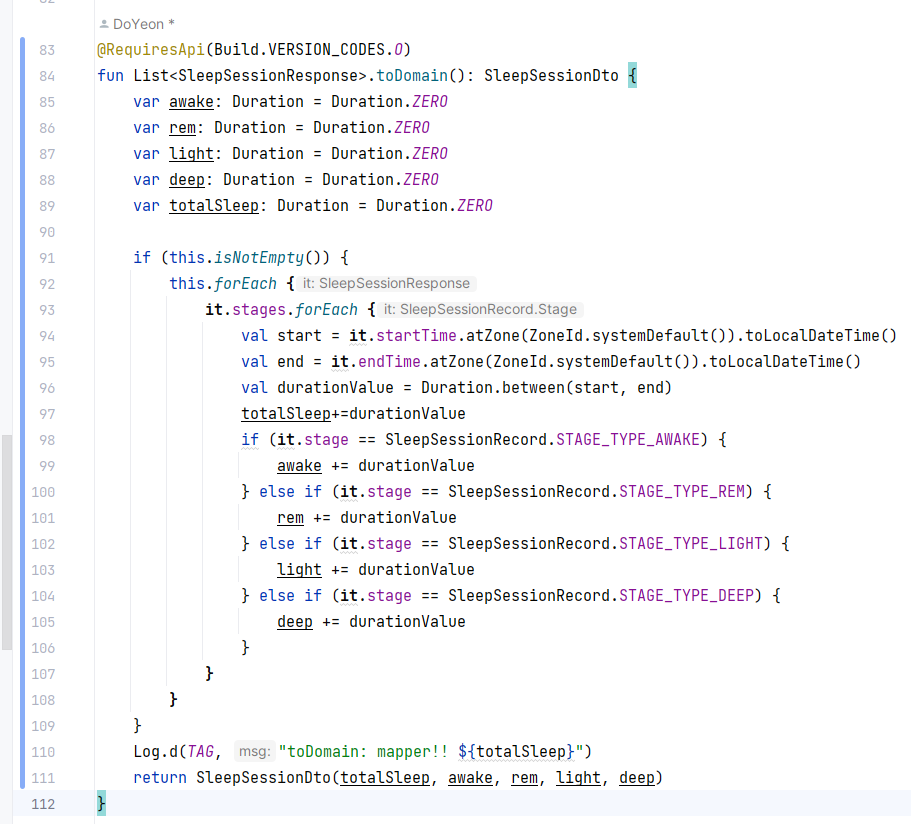 암튼 이렇게 useCase를 통해서 수면 데이터 받고 거기서 if for문으로 수면 값들 합쳐주니