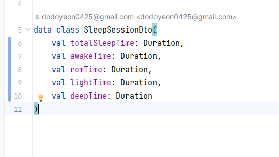 근데 그럴바에는 걍 domain에 있는 model에 총수면 시간, 깬시간, 렘시간, 가벼운 수면, 깊은수면시간 이렇게 저장하는게 낫지 않나? 생각을 했다