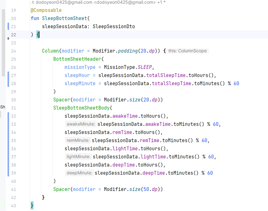 앞에서 본 SleepCottomSheet는 드러운 코드가 없어져 더 간략해졌다. 화면단에서 했던 일을 빼서 관심사 분리가 더 잘 되었다