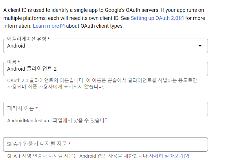 같은 방법으로 안드로이드 어플리케이션으로 하고 클라이언트 id를 만든다